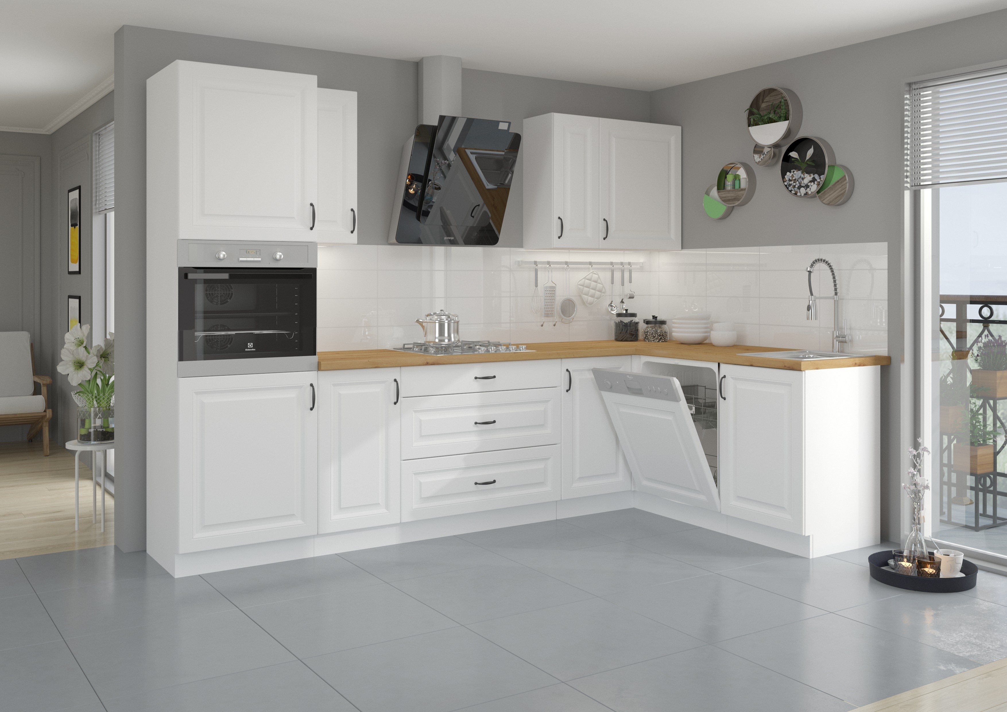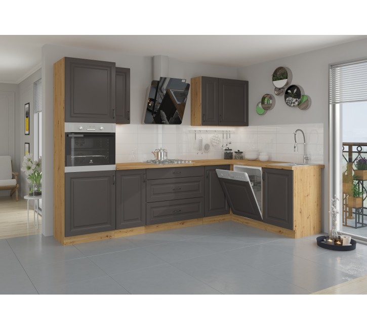 Klasyczny zestaw mebli kuchennych w bardzo modnym połączeniu kolorów. Praktyczne szafki wysokiej jakości wyposażone w cichy domyk, fresowane fronty z płyty MDF oraz metalowe czarne uchwyty. Zestaw kuchenny tworzy przytulną atmosferę.