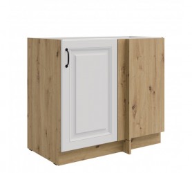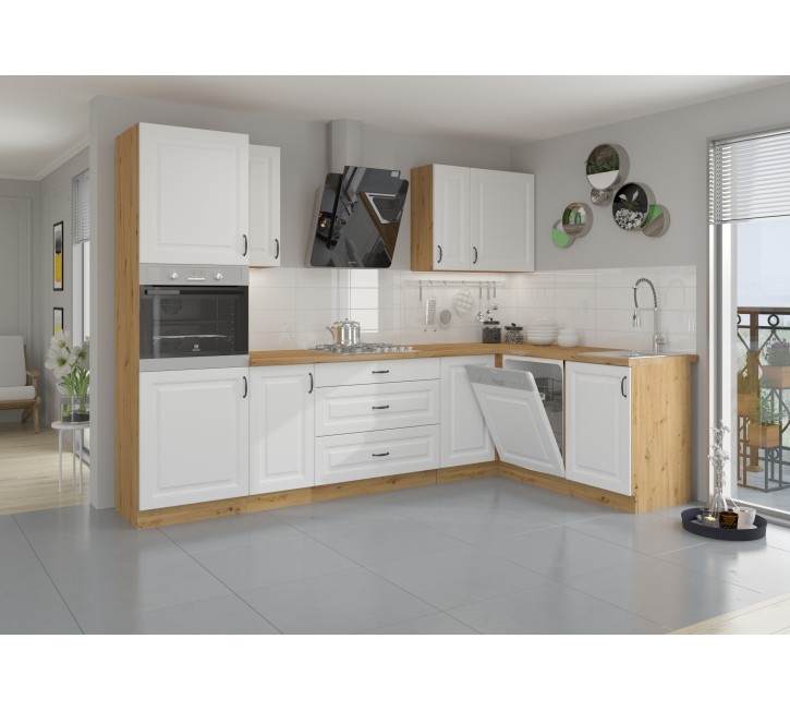 Klasyczny zestaw mebli kuchennych SILO w nowoczesnym wydaniu kolorystycznym korpus dąb artisan -  ciepły odcień drewna z widocznym usłojeniem, który nadaje wnętrzu naturalność oraz białe fronty z mocnej i solidnej płyty MDF, które wyglądają lekko, czysto i optycznie powiększają wnętrze. Frezy na frontach podkreślają zabudowę kuchenną. Czarne metalowe uchwyty kontrastują z białymi frontami, dzięki czemu nadają kuchni charakter. Wybarwienie kuchni jest dobrane w sposób by pasowało do klasycznych i nowoczesnych wnętrz.