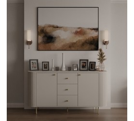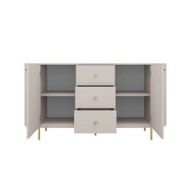 Duża komoda 165 cm z szufladami 2D3S w odcieniu jasnego naturalnego piasku. Trzy praktyczne szuflady z systemem cichego domyku, 4 pojemne przestrzenie. Eleganckie uchwyty i nóżki w kolorze złota.  Komoda łączy funkcjonalność w nowoczesnym designem. Elegancka komoda zaprojektowana z myślą o nowoczesnych wnętrzach.