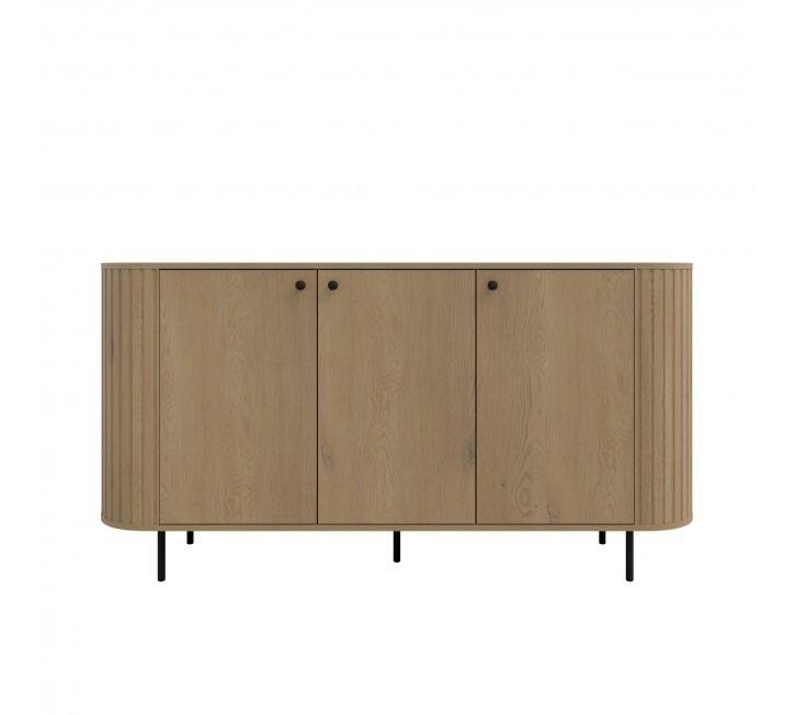 Minimalizm, który przyciąga wzrok. Neutralny, stonowany kolor, który łatwo komponuje się z innymi wybarwianymi. Komoda z szufladami w rozmiarze 165 cm wyróżnia się zaokrąglonymi, ryflowanymi bokami, które nadają teksturę oraz subtelny efekt dekoracyjny. Zaokrąglone boki to wrażenie lekkości i elegancji. Eleganckie złote akcenty dodają całości wyrafinowanego stylu, dzięki czemu mebel staje się nie tylko praktycznym miejscem do przechowywania, ale także ozdobą wnętrza.