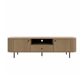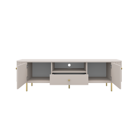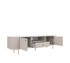Komoda pod telewizor 180 cm wyposażona w dwie pojemne szafki oraz szufladę. Cichy domyk , metalowe złote dodatki dodają elegancji i luksusu. Zaokrąglone, ryflowane fronty zdobią mebel dzięki czemu jest funkcjonalny i pełni funkcję ozdobną w pomieszczeniu.
