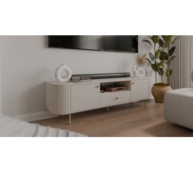 Minimalizm, który przyciąga wzrok. Neutralny, stonowany kolor, który łatwo komponuje się z innymi wybarwianymi. Komoda RTV pod telewizor w rozmiarze 180 cm wyróżnia się zaokrąglonymi, ryflowanymi bokami, które nadają teksturę oraz subtelny efekt dekoracyjny. Zaokrąglone boki to wrażenie lekkości i elegancji. Eleganckie złote akcenty dodają całości wyrafinowanego stylu, dzięki czemu mebel staje się nie tylko praktycznym miejscem do przechowywania, ale także ozdobą wnętrza.