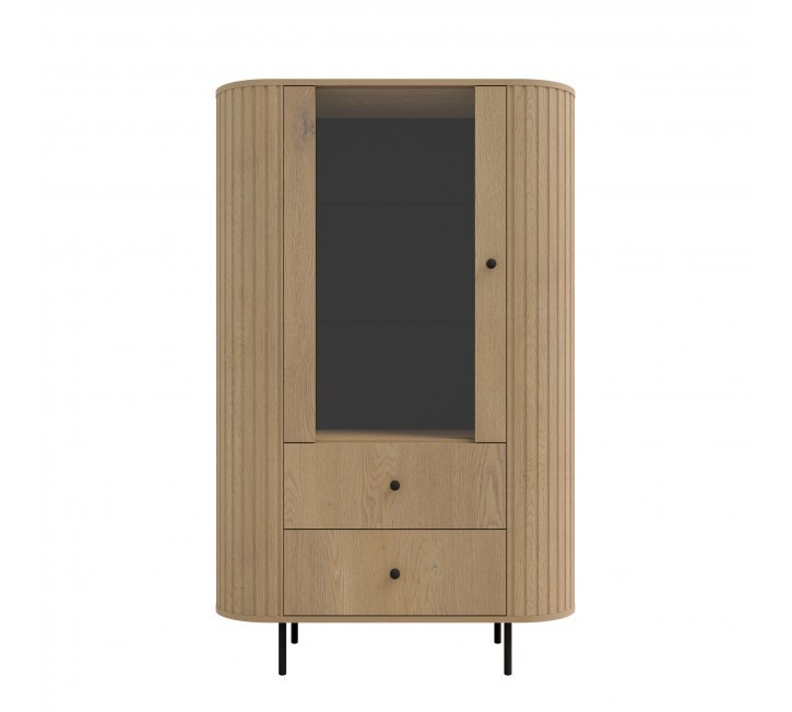 Minimalizm, który przyciąga wzrok. Neutralny, stonowany kolor, który łatwo komponuje się z innymi wybarwianymi. Witryna z szufladami w rozmiarze 100 cm wyróżnia się zaokrąglonymi, ryflowanymi bokami, które nadają teksturę oraz subtelny efekt dekoracyjny. Zaokrąglone boki to wrażenie lekkości i elegancji. Eleganckie złote akcenty dodają całości wyrafinowanego stylu, dzięki czemu mebel staje się nie tylko praktycznym miejscem do przechowywania, ale także ozdobą wnętrza.