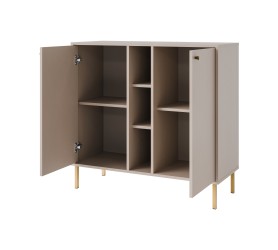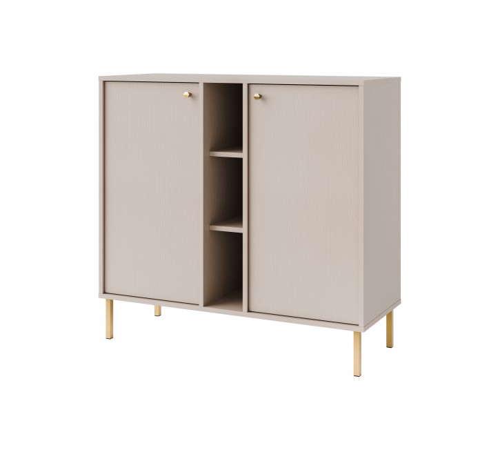 Komoda uchylna dwudrzwiowa została wykonana w sposób estetyczny, pozwalając na umeblowanie nawet najmniejszych wnętrz. Dwa zamknięte wnętrza pozwalają na przechowywanie np. ubrań za to wąski, otwarty moduł z półkami – idealne na książki czy dekoracje. Komoda łączy funkcję zamkniętego i otwartego przechowywania. Idealna do salonu, jadalni czy sypialni. Komoda jest funkcjonalna, ale ma też dekoracyjny charakter.
