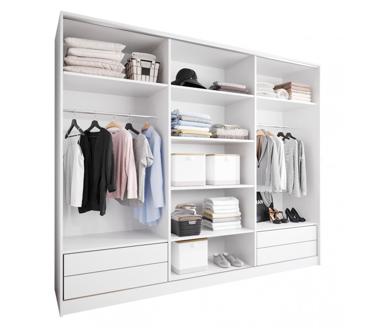 Otwarta szafa 270 cm to bardzo nowoczesna propozycja dla osób, które cenią minimalizm i funkcjonalność. Widoczna przestrzeń w szafie bezfrontowej pozwala na łatwy dostęp i nowoczesne użytkowanie. Otwarta garderoba 270 cm to także estetyka - wygląda bardzo stylowo oraz lepsza organizacja - szafa zachęca do utrzymania porządku.